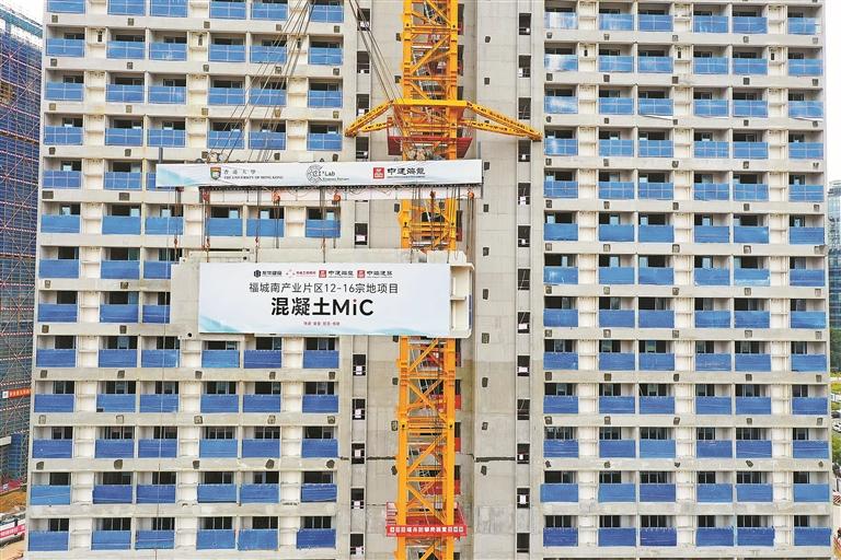 福城南产业片区12-16宗地项目混凝土MiC模块吊装现场。