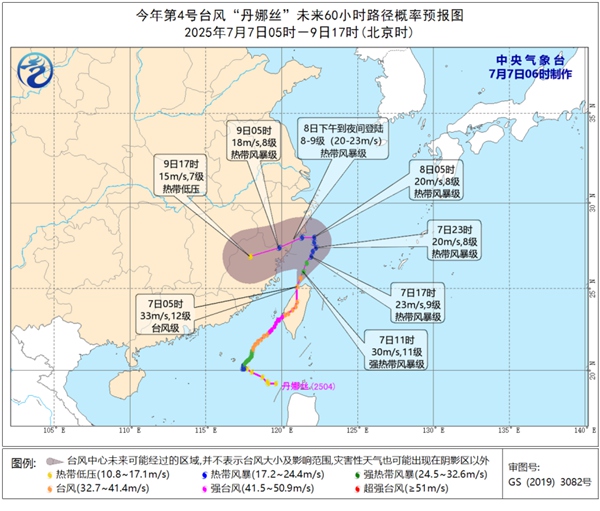 今天(7月7日)凌晨,台风“丹娜丝”登陆台湾嘉义县沿海,登陆时强度为台风级,截至7时前后,它已减弱为强热带风暴。预计“丹娜丝”将继续北上,不排除登陆我国浙江、福建沿海的可能,公众需密切关注台风动向,做好防台风措施。今明天,我国高温范围将缩减,但闷热天气格局难以改变,尤其是江南一带昼夜蒸煮,焖蒸感明显,仍需持续做好防暑措施。
