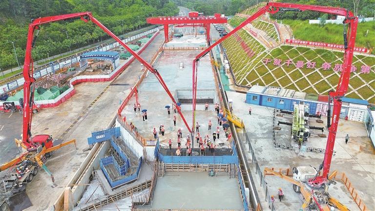 在鹭湖站施工现场,伴随着机械轰鸣声,车站主体结构20至22轴顶板浇筑完成,标志着地铁22号线迎来首座车站封顶。