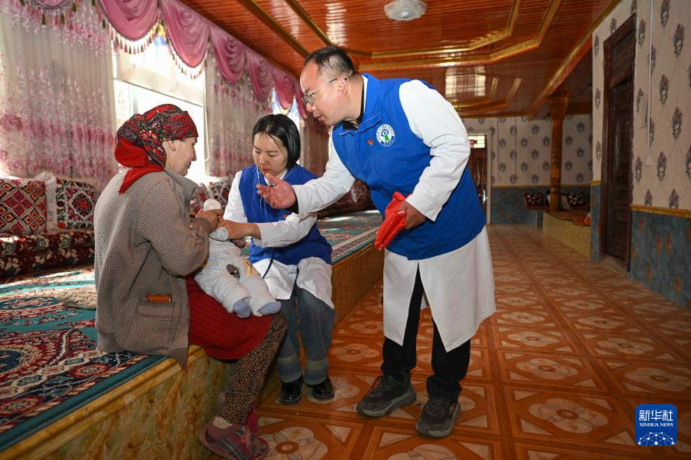 在新疆塔什库尔干塔吉克自治县库科西鲁格乡瓦窑本村,深圳援疆新生儿科医生潘千(中)与同事许林森(右)在村民家为新生儿检查身体,并叮嘱养护注意事项(2025年3月24日摄)。