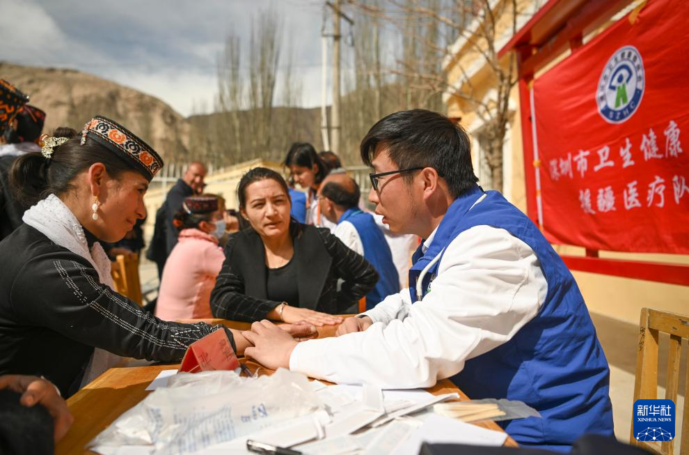 在新疆塔什库尔干塔吉克自治县库科西鲁格乡卫生院,深圳援疆医生张强(右一)为村民把脉(2025年3月24日摄)。