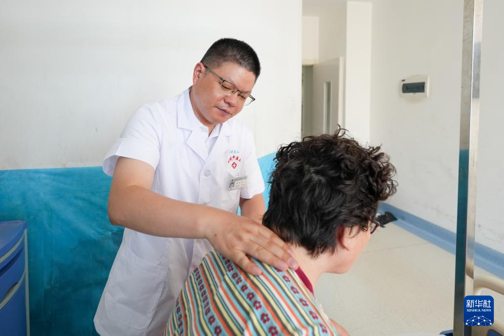 在新疆伊犁哈萨克自治州中医医院,江苏援疆医生张仕兵(左)为患者检查身体(2025年7月6日摄)。