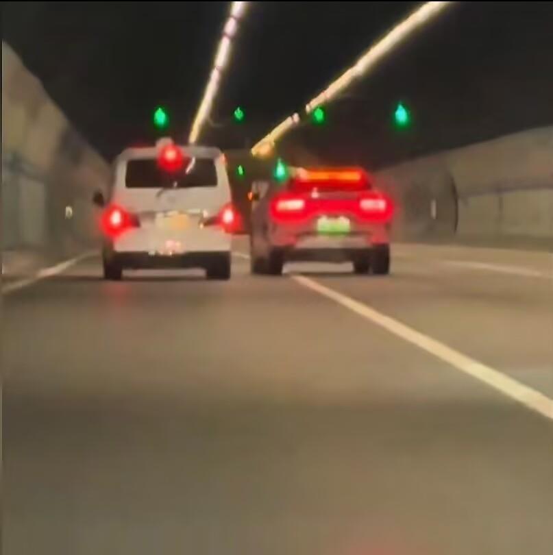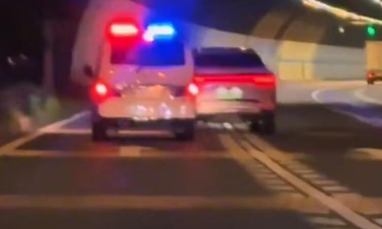 视频显示,在一处隧道内,一辆小车连续变道,多次压实线、踩刹车别挡一辆警车。