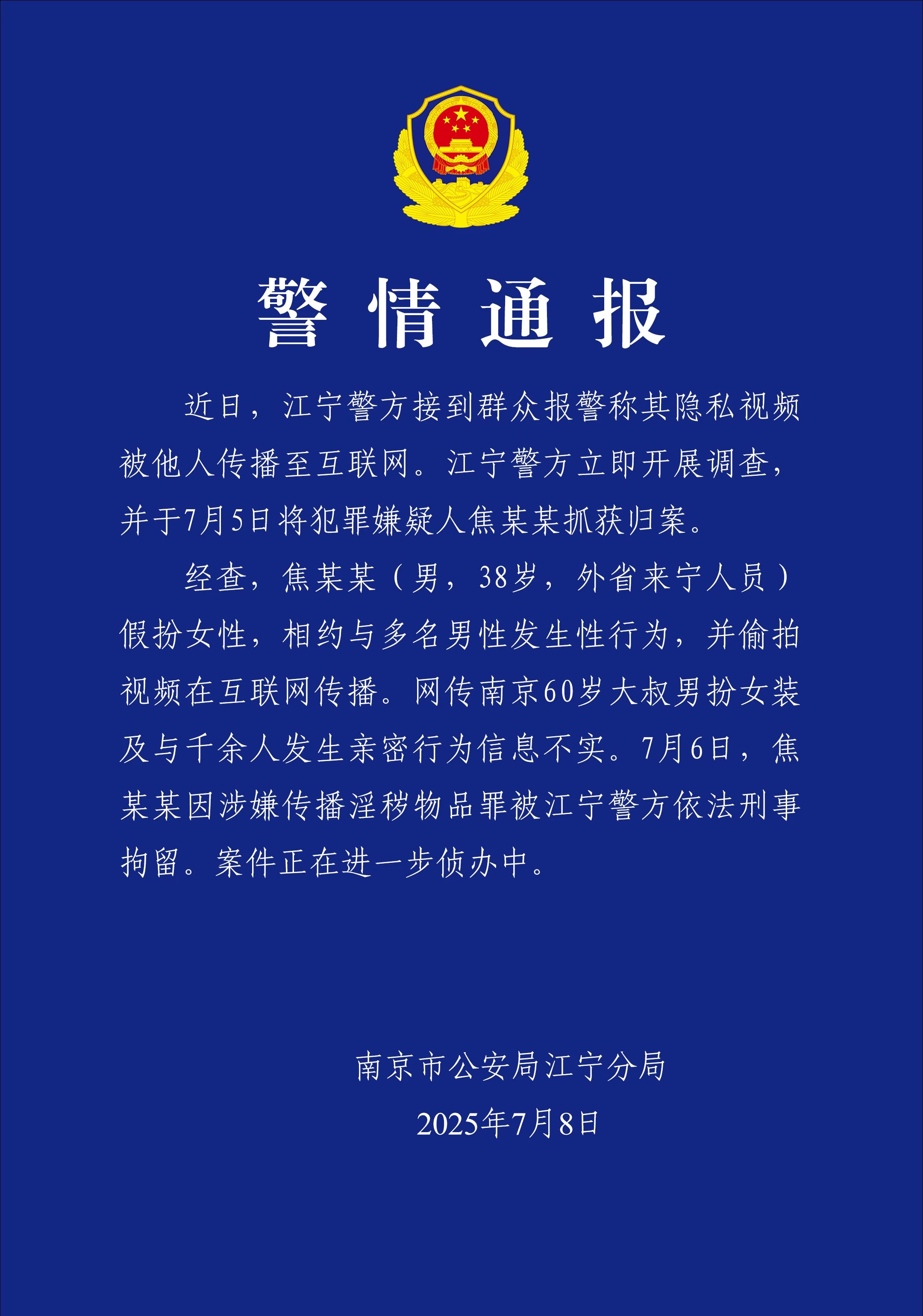经查,焦某某(男,38岁,外省来宁人员)假扮女性,相约与多名男性发生性行为,并偷拍视频在互联网传播。网传南京60岁大叔男扮女装及与千余人发生亲密行为信息不实。7月6日,焦某某因涉嫌传播淫秽物品罪被江宁警方依法刑事拘留。案件正在进一步侦办中。
