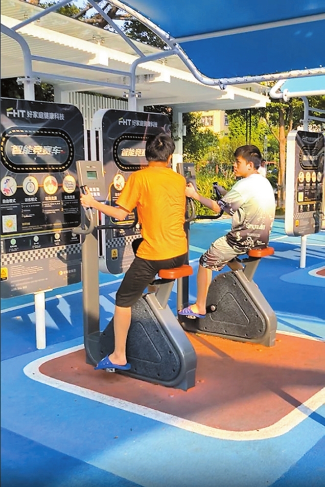 不远处的室外智能健身房,陈伯一边蹬着智能竞赛车一边对记者说:“这家伙(智能竞赛车)可聪明了,记得我血压高,刚才还提醒我慢一点。”