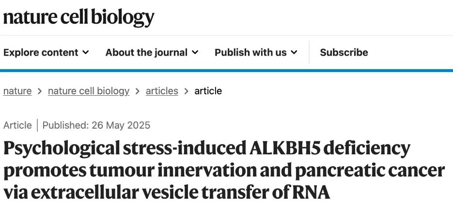 2025年5月,中山大学肿瘤防治中心在《自然细胞生物学》发表的研究指出,精神压力竟会关闭抗癌基因,促进瘤内神经生长,助力癌症进展。