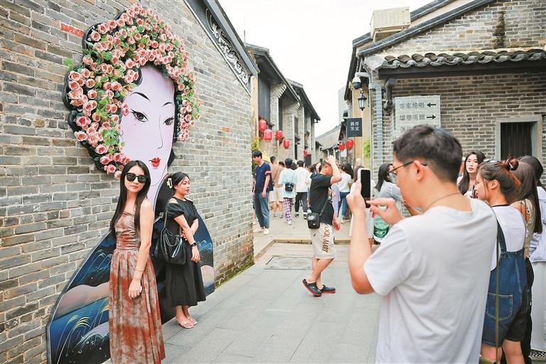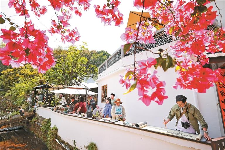 观澜版画村依山傍水而建,坐落在牛湖水旁,建筑是客家传统的排屋形制,有古香古色的古屋、宗祠、水塘等,客家风情浓厚,是集版画创作、生产、展览、销售等为一体的国家级版画产业示范基地。一排排的房屋倒映在水面,远处青山如黛,门前摆放着桌椅、棋盘,高挂着灯笼,生活气息扑面而来。漫游版画村,触摸时代留下的印记,感受独特的客家文化。