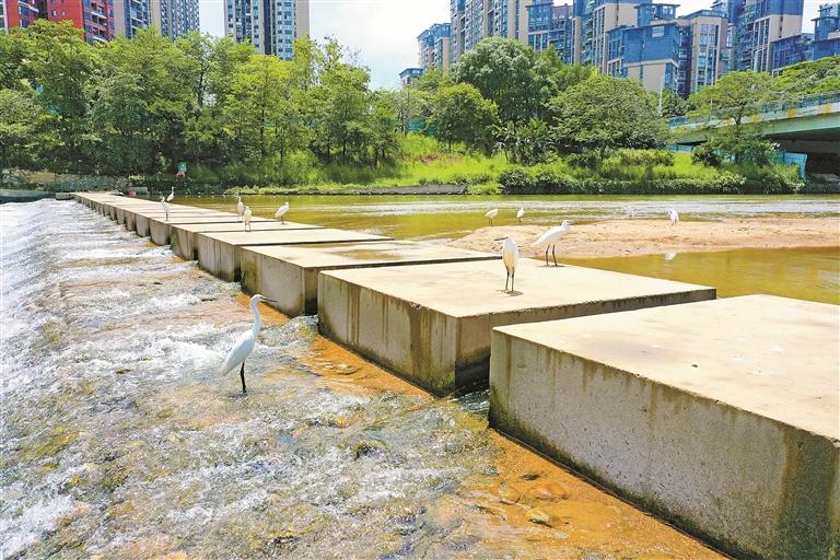 观澜河翠幽路段,是人们观赏白鹭的胜地。漫步河畔,河水清澈,两岸绿树葱郁,乘着微微的凉风,心情也更加舒畅了。碧水云天之间,这里随处可见白鹭的身影,它们或戏水,或悠然觅食,或上下翩飞,秀美而灵动,装点着龙华河道景观。拿出相机,定格精彩、美好的一瞬间,记录绚丽的生态画卷。