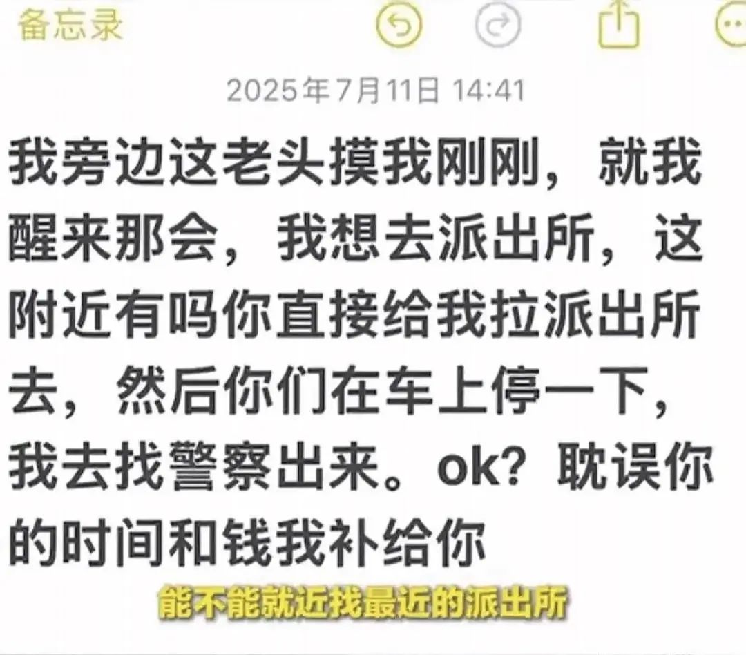 “我旁边这老头摸我刚刚,就我醒来那会,我想去派出所,这附近有吗?”7月11日下午,行驶中的司机收到了后排乘客程女士的求助短信。