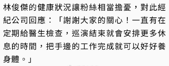 7月14日,据三湘都市报,针对心脏出问题消息,林俊杰经纪公司回应:“谢谢大家的关心!一直有在定期给医生检查,巡演结束就会安排更多休息的时间,把手边的工作完成就可以好好养身体。”