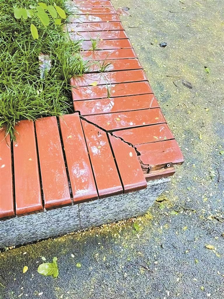 供游人休憩的座椅同样状况不佳。木质椅面破裂严重,内部结构暴露,铁钉直接裸露在外,对使用者尤其是儿童,极易构成划伤、刺伤风险。“带孙子来玩,看到这些破损的器材和露出的钉子,心都是悬着的。”一位在三祝里公园带孩子的奶奶对深晚记者说。