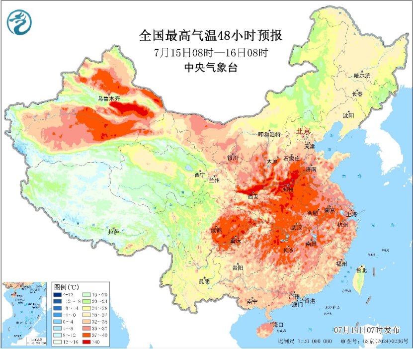 高温方面,未来三天,其影响范围还将保持逐步扩展的状态,15日至16日为高温影响范围最广、强度最强的时段。其中今天,高温将扩展至江南北部,预计华北中南部至江南北部、新疆等地将出现大范围高温天气,河北南部、山东西部、河南大部、山西西南部、陕西关中、湖北北部和西部、重庆大部、四川东部、湖南北部及新疆吐鲁番盆地等地部分地区最高气温有37~39℃,陕西关中、河南中部、新疆吐鲁番盆地等局地可达40℃以上。明后两天,日最高气温可达37℃以上的范围涉及黄淮至江南的大片区域,部分地区气温可超过40℃。