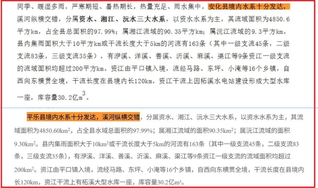 地图测量显示,广西平乐县和湖南安化县两地相距400余公里。而上述两县的水文文字,除两个县的名字不同外,其他部分一模一样,而平乐县并无文中提到的平口镇、小淹等乡镇。