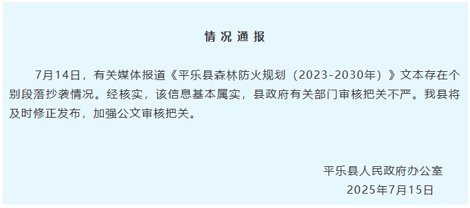 7月14日,有关媒体报道《平乐县森林防火规划(2023-2030年)》文本存在个别段落抄袭情况。经核实,该信息基本属实,县政府有关部门审核把关不严。平乐县将及时修正发布,加强公文审核把关。