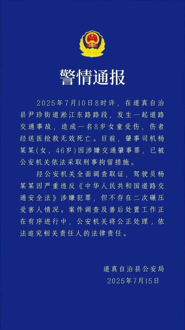 2025年7月10日8时许,在道真自治县尹珍街道淞江东路路段,发生一起道路交通事故,造成一名8岁女童受伤,伤者经送医抢救无效死亡。目前,肇事司机杨某某(女,46岁)因涉嫌交通肇事罪,已被公安机关依法采取刑事拘留措施。