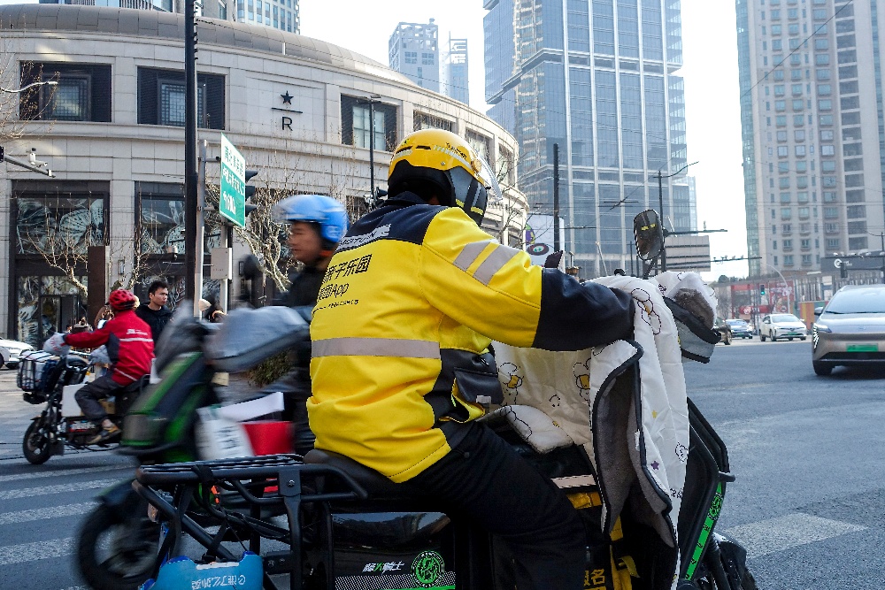 京东、美团、饿了么的外卖配送员在街头相遇。东方IC 图