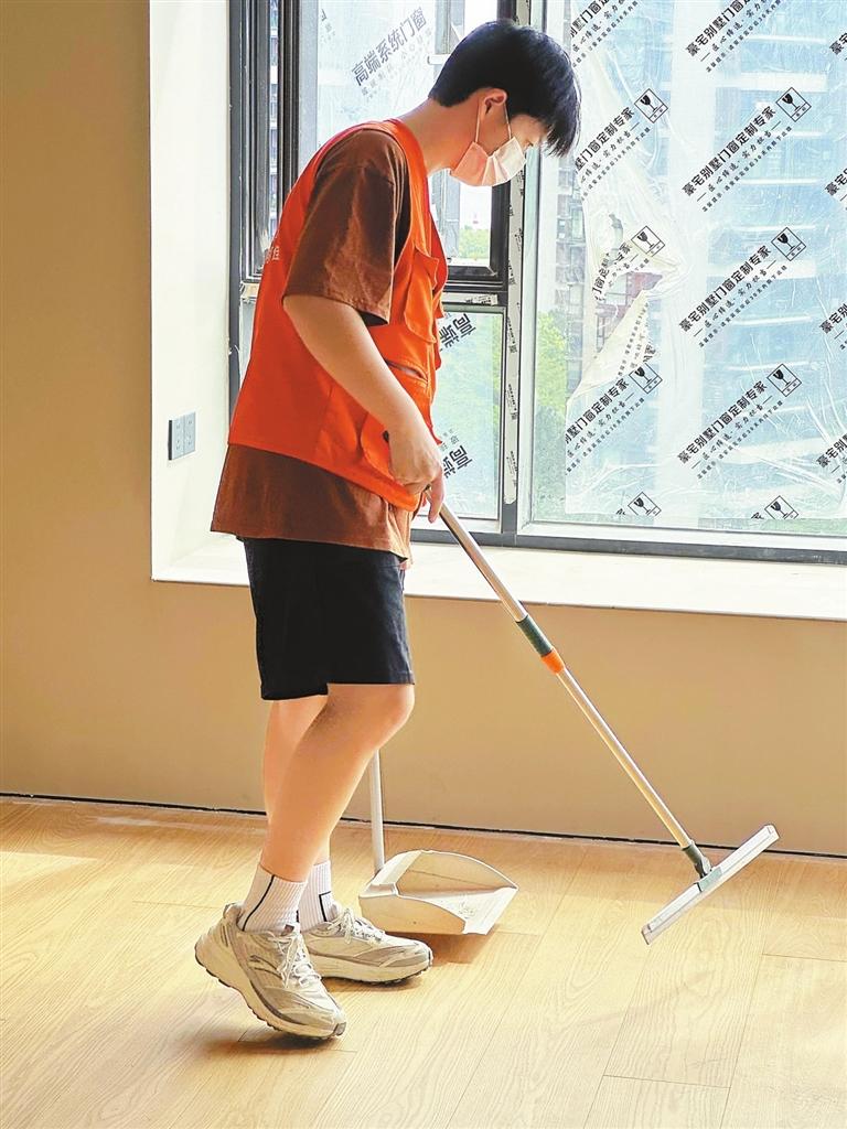 同一站点的姜子豪则带着军人气质。这位23岁的退役军人在同学介绍下入了职,他话不多,干活利索,每单都完成得既精准又漂亮。“内务整理是部队基本功,擦玻璃能照出人影才达标。”退役军人的身份助他赢得了客户额外信任,他也以高标准的工作成果回报这份珍贵的情感。