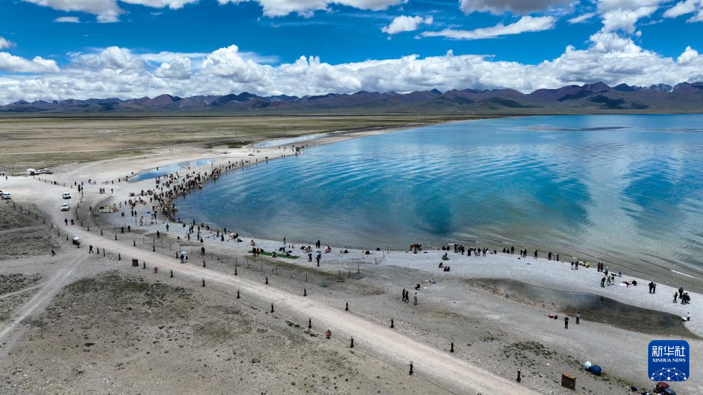 7月16日,在西藏拉萨市当雄县纳木错扎西岛景区,来自世界各地的游客享受着夏日纳木错清爽的风。纳木错湖面海拔4718米,是世界上面积超过1000平方公里的湖泊中海拔最高的湖泊。2024年,纳木错扎西岛景区接待游客约40万人次。