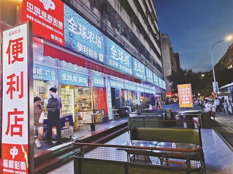 强先生是福建人,在深圳经商打拼多年,“全球系”店铺在车公庙片区有20多家,大部分由他自己经营,还有一部分通过出租加合作的模式交由他人运营,除了餐饮店、便利超市、茶叶批发店等,这里还有福利彩票站点、棋牌室、桌游室、健身房等,可满足吃喝玩乐各项需求。