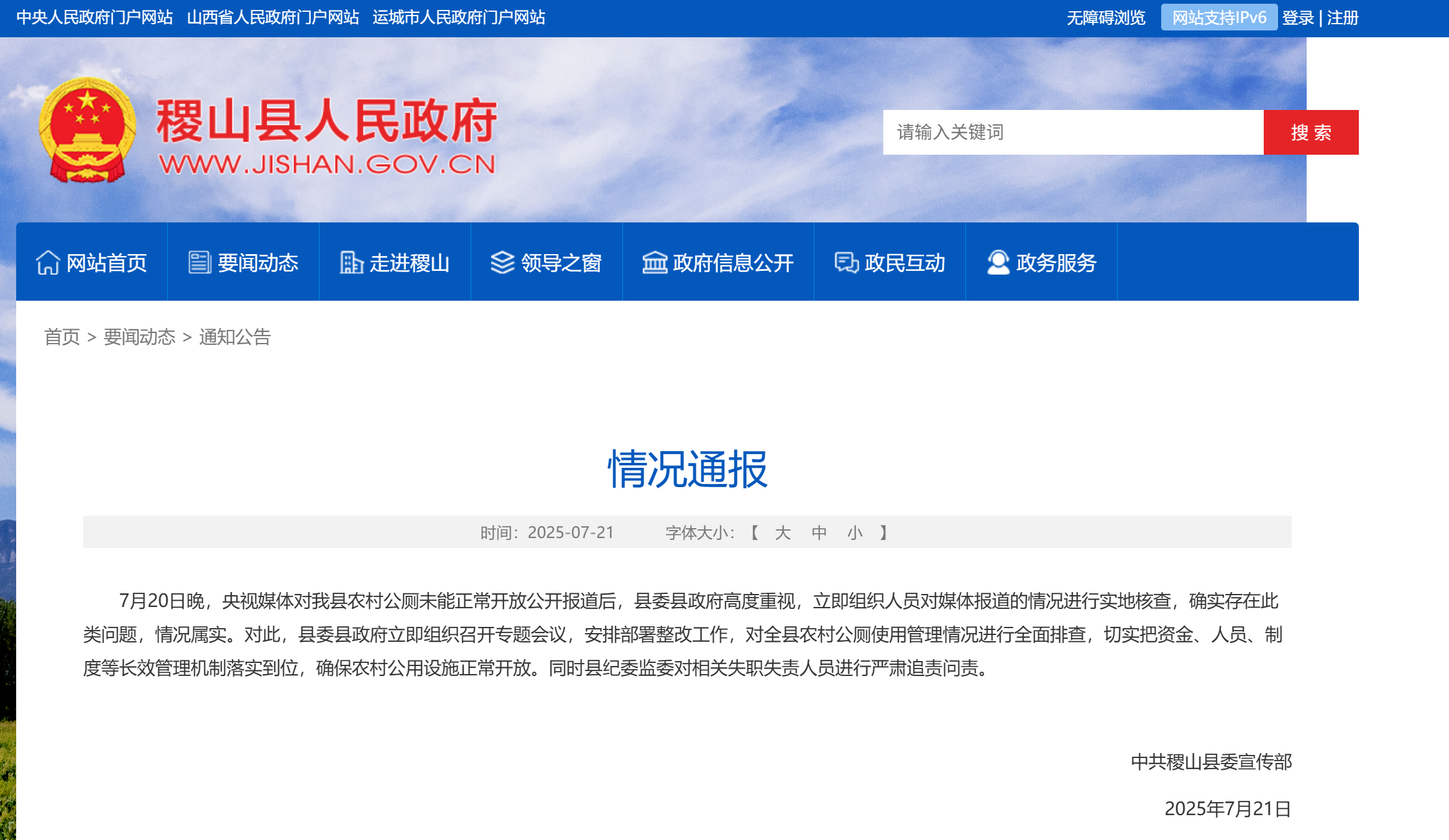 7月20日晚,央视媒体对稷山县农村公厕未能正常开放公开报道后,稷山县委县政府高度重视,立即组织人员对媒体报道的情况进行实地核查,确实存在此类问题,情况属实。对此,稷山县委县政府立即组织召开专题会议,安排部署整改工作,对全县农村公厕使用管理情况进行全面排查,切实把资金、人员、制度等长效管理机制落实到位,确保农村公用设施正常开放。同时县纪委监委对相关失职失责人员进行严肃追责问责。