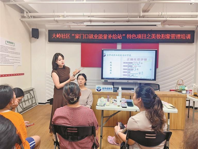 龙华新闻讯(记者 王雪敏 通讯员 谭媛媛 张洁茹/文 记者 蔡维泽/图)“原来干性皮肤要分层保湿,难怪我总卡粉!”“职场淡妆三步法太实用了!”近日,民治街道大岭社区“家门口就业能量补给站”美妆形象管理培训热闹开课,20名居民在专业指导下解锁美妆技巧,现场笑声掌声不断。