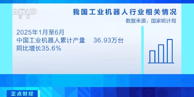 最新数据显示,2025年1至6月中国工业机器人累计产量36.93万台,同比增长35.6%。