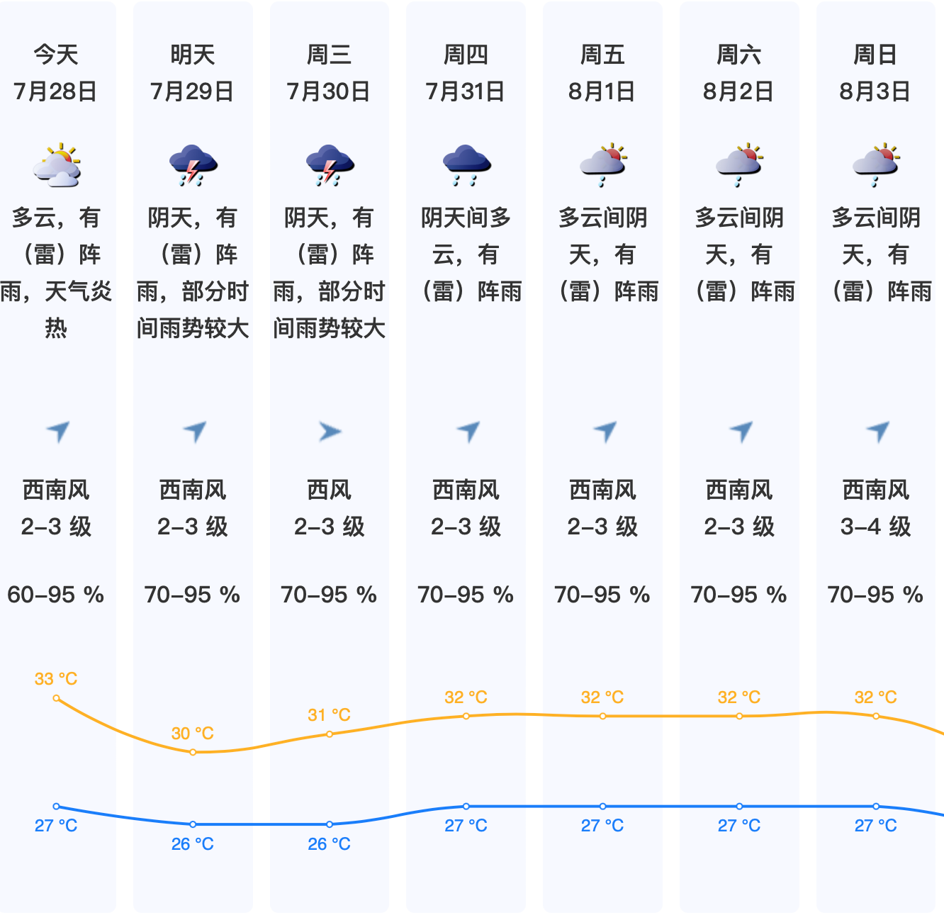 7月28日,深圳多云,有(雷)阵雨,天气炎热;气温27-33℃,中北部和人口密集区最高气温可达35℃或以上;相对湿度60%-95%。