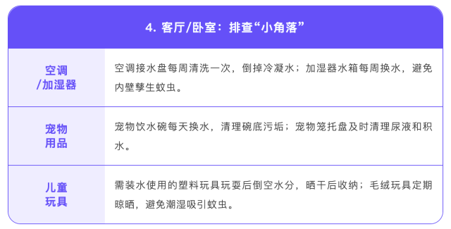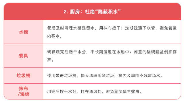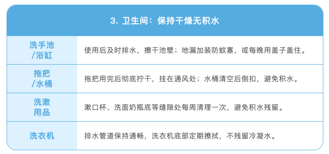 家庭作为蚊虫孳生和叮咬的高频场景,是防控的第一道防线。《清单》核心原则是清除蚊虫孳生地。《清单》提示,家中的阳台/窗台要重点清理积水容器,包括每周彻底清洗花盆托盘,避免积水;小型鱼缸/水池可投放食蚊鱼。厨房要杜绝“隐蔽积水”,餐后及时清理水槽残留水,用抹布擦干;定期疏通下水管,避免管道内积水。卫生间要保持干燥无积水,洗手池/浴缸,使用后及时排水,擦干池壁;漱口杯、洗面奶瓶底等缝隙处每周清理一次,避免积水残留。客厅/卧室要排查“小角落”,例如空调接水盘每周清洗一次,倒掉冷凝水;需装水使用的塑料玩具玩耍后倒空水分,晒干后收纳。在户外/庭院,要定期疏通排水沟,清除落叶、淤泥;池塘、喷泉等安装循环系统,假山等需每周冲洗可积水的凹陷处,防止蚊虫孳生。