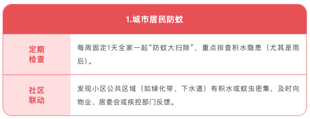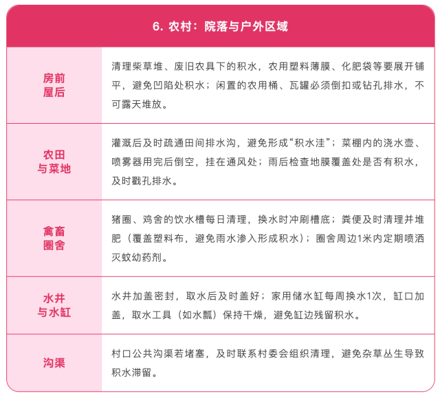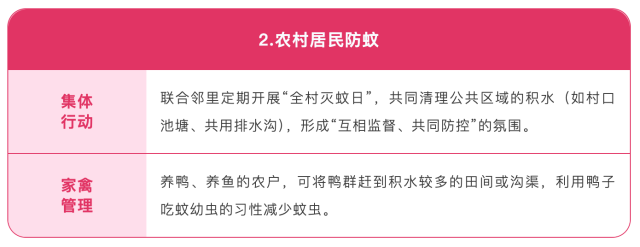 《清单》还提及城市和农村居民防蚊的措施。城市居民防蚊:每周固定1天全家一起“防蚊大扫除”,重点排查积水隐患(尤其是雨后);发现小区公共区域(如绿化带、下水道)有积水或蚊虫密集,及时向物业、居委会或疾控部门反馈。农村居民防蚊:联合邻里定期开展“全村灭蚊日”,共同清理公共区域的积水(如村口池塘、共用排水沟),形成“互相监督、共同防控”的氛围;养鸭、养鱼的农户,可将鸭群赶到积水较多的田间或沟渠,利用鸭子吃蚊幼虫的习性减少蚊虫。