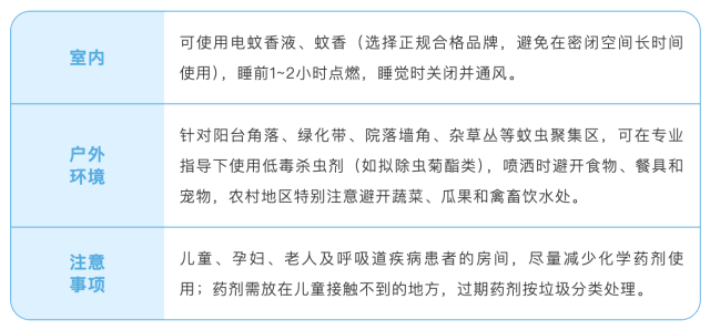 必要时科学用药剂,可使用电蚊香液、蚊香(选择正规合格品牌,避免在密闭空间长时间使用),睡前1~2小时点燃,睡觉时关闭并通风。室外阳台角落、绿化带、院落墙角、杂草丛等蚊虫聚集区,可在专业指导下使用低毒杀虫剂(如拟除虫菊酯类),喷洒时避开食物、餐具和宠物,农村地区特别注意避开蔬菜、瓜果和禽畜饮水处。