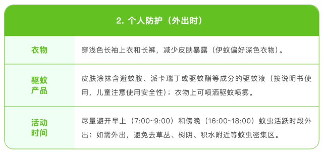 《清单》提示,要做好物理防护,减少蚊虫叮咬机会。傍晚和清晨(伊蚊活跃时段)尽量关闭门窗,或使用纱窗通风;在家里放置灭蚊灯(建议选择物理电击式,避免化学污染),每周清理一次蚊尸和电网。外出时穿浅色长袖上衣和长裤,减少皮肤暴露(伊蚊偏好深色衣物);尽量避开早上(7:00~9:00)和傍晚(16:00~18:00)蚊虫活跃时段外出;如需外出,避免去草丛、树阴、积水附近等蚊虫密集区。
