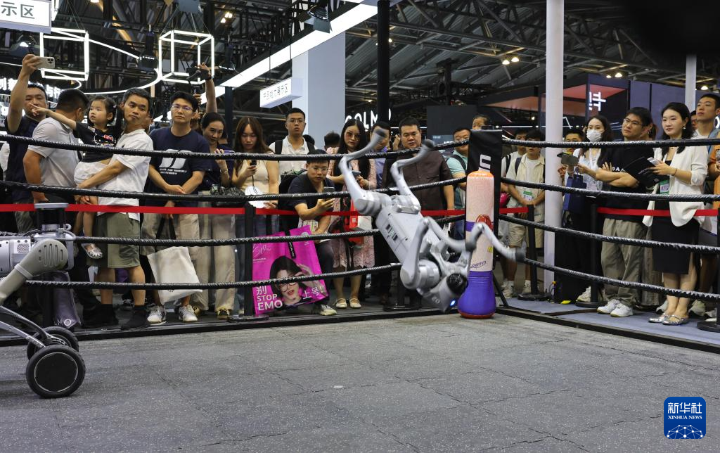 7月26日,参观者观看四足机器人进行后空翻表演。新华社记者 方喆 摄
