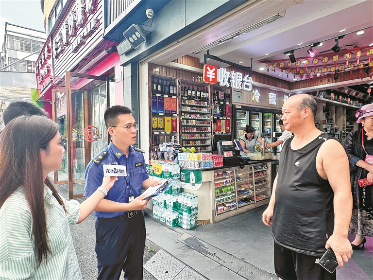 龙华新闻讯(记者 吴雪平 通讯员 宋喆/文 记者 蔡维泽/图)日前,2025年第七期《龙华“执”播》开播,本次行动聚焦辖区“六乱一超”乱象治理,观湖街道执法人员走进沿街商铺和集贸市场,依法开展“六乱一超”专项执法检查,人大代表邹永芳、政协委员陈港伦全程参与监督。