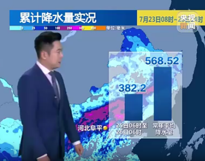 7月25日,内蒙古、河北等地强降水天气持续,河北张家口、保定,内蒙古呼和浩特、乌兰察布、锡林郭勒、赤峰、通辽等地部分地区出现大暴雨,河北张家口康保、保定阜平出现特大暴雨(269毫米至375毫米)。其中,河北阜平常年平均降水量为568.52毫米,25日06时-26日06时,阜平降雨量为382.2毫米。