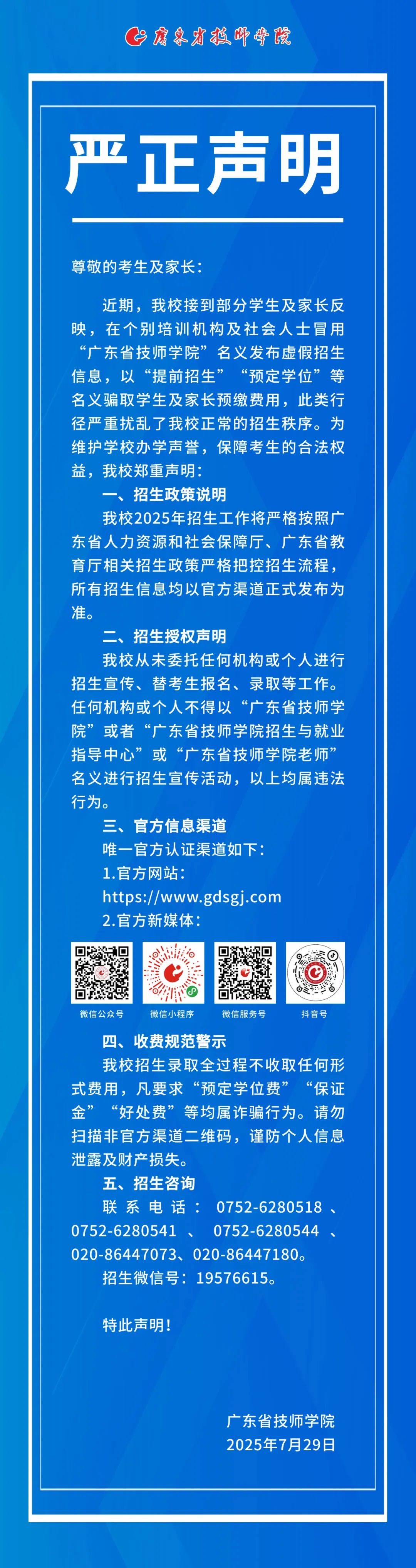 7月29日,广东省技师学院发布严正声明称,近期,广东省技师学院接到部分学生及家长反映,有个别培训机构及社会人士冒用“广东省技师学院”名义发布虚假招生信息,以“提前招生”“预定学位”等名义骗取学生及家长预缴费用,此类行径严重扰乱了广东省技师学院正常的招生秩序。