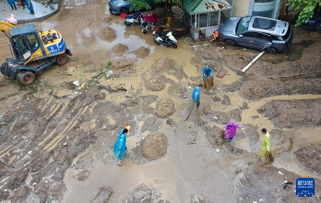 8月6日,工作人员在广东肇庆鼎湖区鼎湖山风景区门口清淤(无人机照片)。