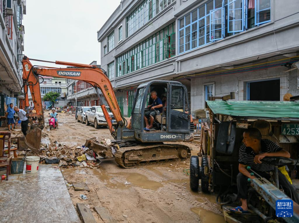 8月6日,在广东清远佛冈县石角镇黄花村,工作人员用挖掘机将村民清理出的淤泥与杂物转移到拖拉机上统一清运。新华社记者 肖恩楠 摄