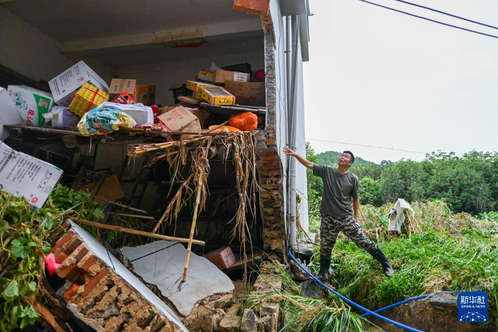 8月6日,广东清远佛冈县石角镇黄花村党委书记李庚原在一栋被冲毁的房屋旁了解房屋受损情况。新华社记者 肖恩楠 摄