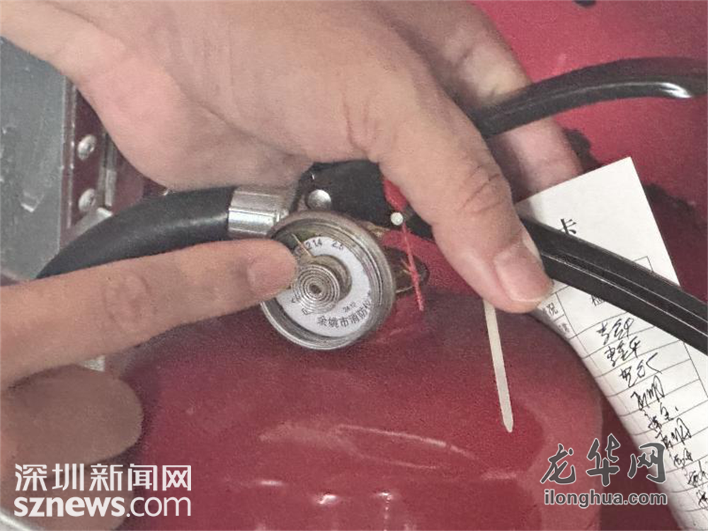 执法人员一行随后检查室内消火栓和灭火器,室内消火栓一般包括消防给水管道及消火栓接口、消防水带及消防水枪。这个消火栓箱分为上下两部分,上部放置消火栓及其附件,下部放置灭火器。