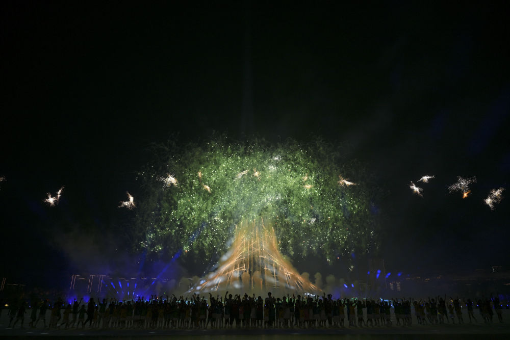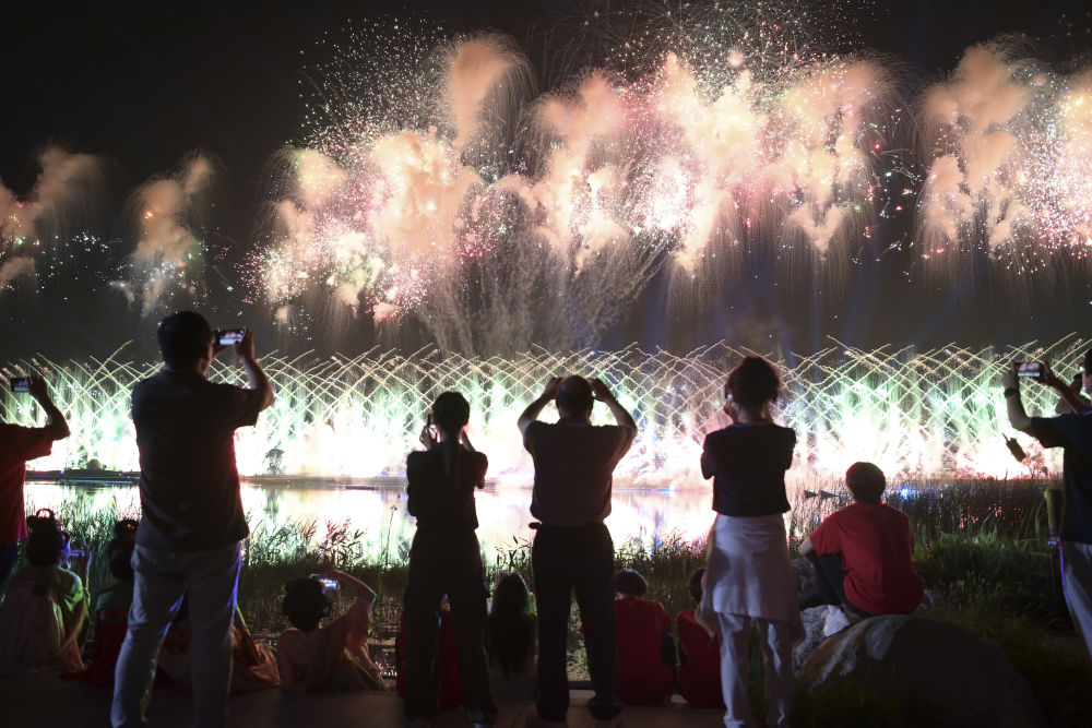 ↑这是开幕式现场燃放的焰火。新华社记者 陈益宸 摄