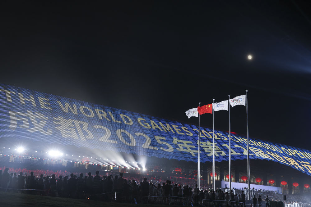 ↑这是开幕式上拍摄的成都世运会组委会会旗、中华人民共和国国旗、国际世界运动会协会会旗、国际奥林匹克委员会会旗(从左至右)。