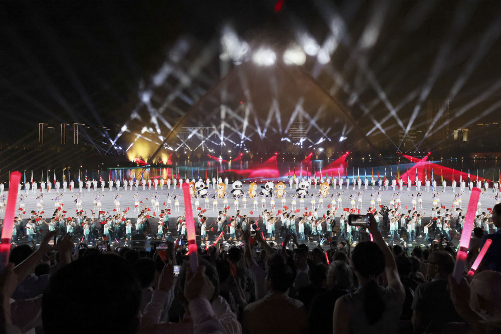 ↑德国代表团成员在开幕式上与吉祥物“锦仔”互动。 新华社记者 鲍菲菲 摄