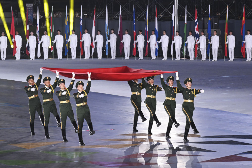 ↑中华人民共和国国旗在开幕式上入场。新华社记者 刘坤 摄