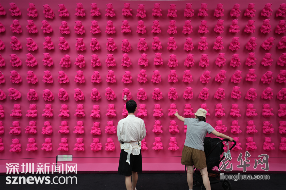 窦欣然是来自江苏的一名学生,她未来打算往艺术方向学习和发展,于是趁着暑假期间,来到深圳游玩,顺道参观深圳美术馆“开开眼界”。她表示,整个展览非常多元化,有很现代、潮流的元素,其中布满小熊玩偶的墙最让她眼前一亮。