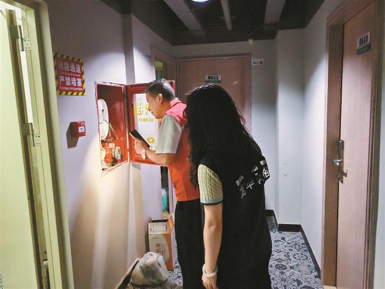 白石龙城中村楼栋长和网格员检查楼栋消防设施。