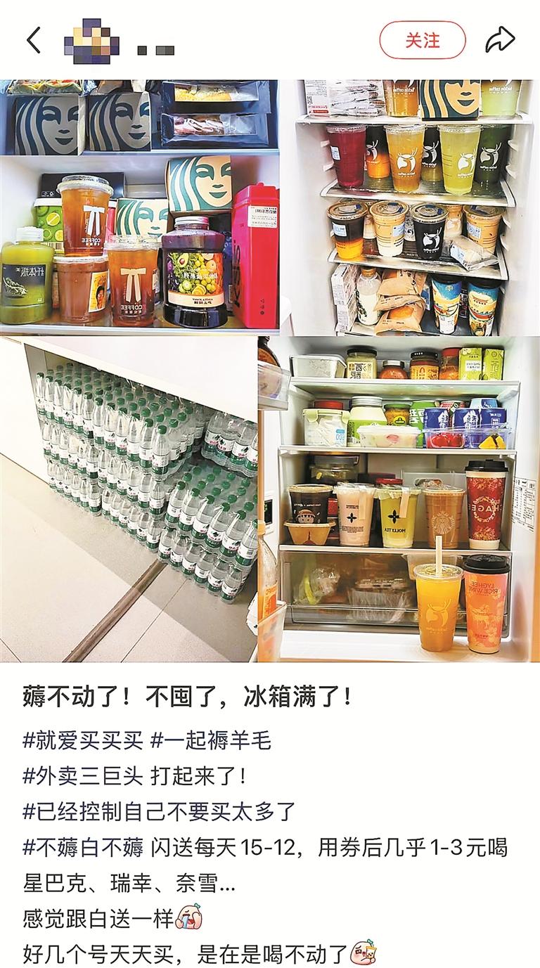 外卖骑手是这场消费狂欢的见证者。美团骑手老李告诉记者:“最近送的订单中,咖啡奶茶特别多,经常一天给同一个人送好几次。”他也发现,很多顾客收到外卖后并不立即食用,“有时候下午送的外卖,晚上经过时还挂在门上”。