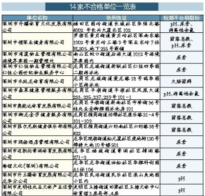 本次共检测游离性余氯、浑浊度、尿素、pH、菌落总数、大肠菌群等六项指标,14家不合格的游泳场所,不合格指标主要为尿素、pH值、菌落总数、游离性余氯和大肠菌群。本次抽查的14家不合格泳池,福田区1家、罗湖区1家,南山区1家,龙岗区6家,龙华区4家,光明区1家。