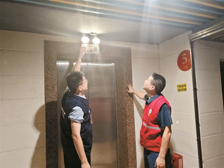 ▲福城楼栋长王约辉与社区网格员开展安全隐患排查工作。