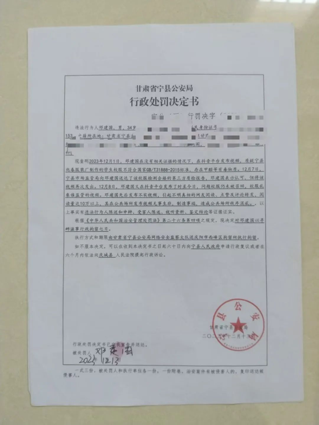 8月12日,据澎湃新闻,因在网上反映儿子学校校服质量问题,邓建国被宁县公安局网络安全监察大队以寻衅滋事罪行政拘留7天。
