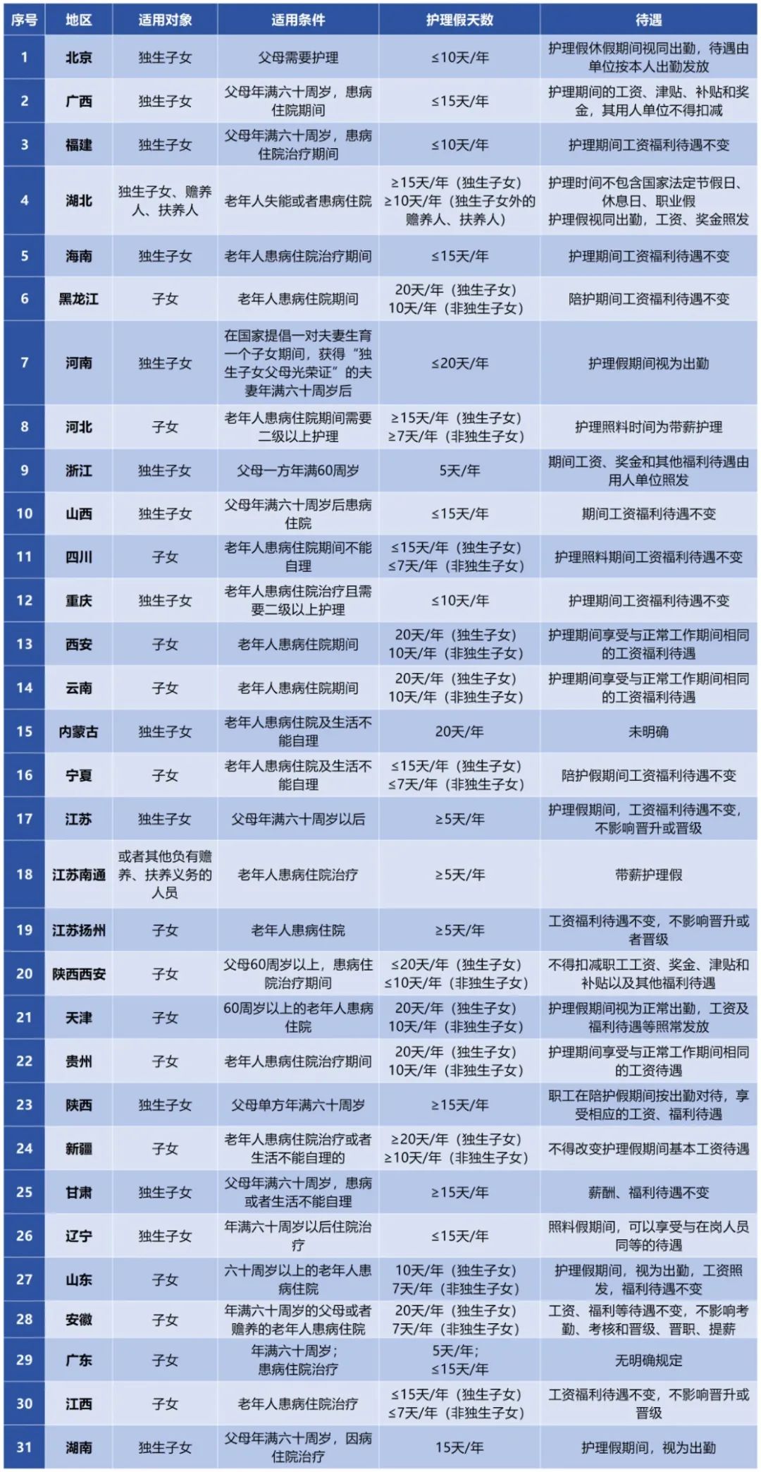 ● 广东、广西、河南、浙江等多地子女可申请“护理假”,最多的可以休20天,工资奖金照发。详情>>